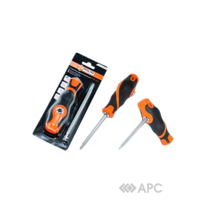 Двухсторонняя отвертка Polax — удобный инструмент, предназначенный для бытового использования. Оснащена длинной переставной насадкой PH2/SL6, которая трансформирует отвертку в классическую форму либо Т-образную. Быстрая замена шлица с плоского на крестообразный позволяет не держать под рукой дополнительных бит.