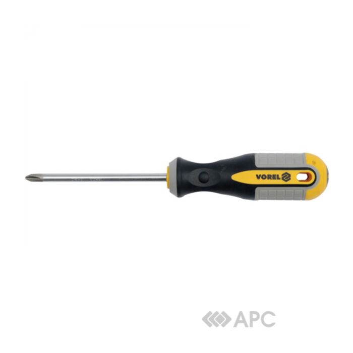 Отвертка крестообразная Vorel - это отличный выбор как для домашнего, так и профессионального использования. Стержень изготовлен из прочной хром-ванадиевой стали. Ручка прорезиненная, что обеспечит антискользящий эффект и надежную фиксацию в руке мастера. Модель оснащена отверстием для удобного подвешивания на панели для инструментов.