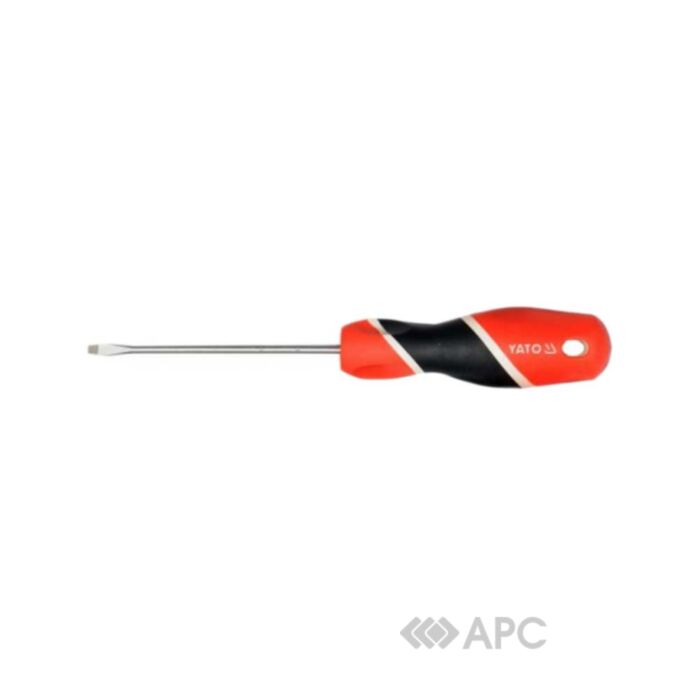 Плоская отвертка Yato YT-25904 - ручной инструмент предназначен для закручивания или раскручивания крепежных элементов (болтов, винтов или шурупов). Ее могут использовать для работы в профессиональных целях. Рабочая часть изготовлена из стали марки S2 со степенью твердости 58 HRC. Магнитный наконечник значительно облегчает работу. Длина стержня составляет 100 мм, шлица - 4 мм. Трехкомпонентная ручка надежно держится в руках и устойчива к неблагоприятным условиям. На кончике ручки есть отверстие, за которое можно повесить инструмент в удобном месте. Отвертку Yato YT-25904 нужно использовать с прямым типом шлица (SL).