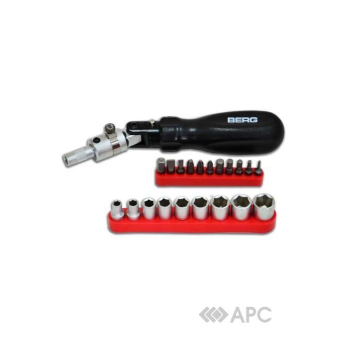 Многофункциональная отвертка Berg 47-465 обеспечивает высокую эффективность работы благодаря наличию функций реверса и поворота. При необходимости можно повернуть ручку на 90°, что обеспечит мощный рычаг для создания дополнительного крутящего момента. В наборе с отверткой идут хром-ванадиевые биты (плоские, крестообразные, адаптер для 1/4" и другие), а также шестигранные торцевые головки. Всего насадок в наборе: 20 шт.