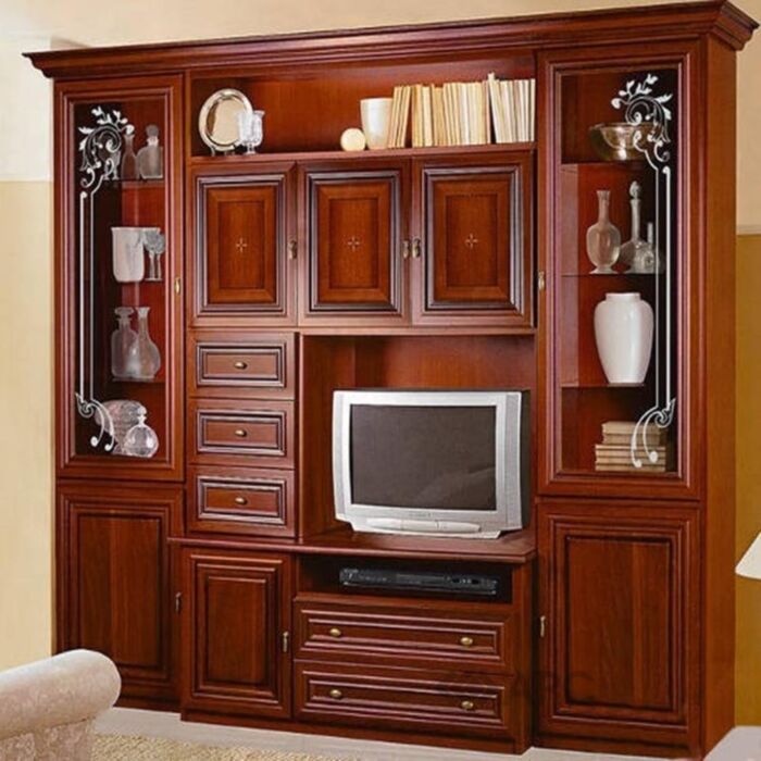 Популярная модификация стенки Капри насчитывает красивые витрины с зеркальными дверцами, тумбу под телевизор, выдвижные ящики и открытые полки. Общий ансамбль мебели для гостиной прекрасно вписывается в помещение различной величины. Стенка имеет аккуратный, презентабельный вид. Ширина стенки по карнизам 272 см, карнизы выступают на 6 см с каждой стороны.