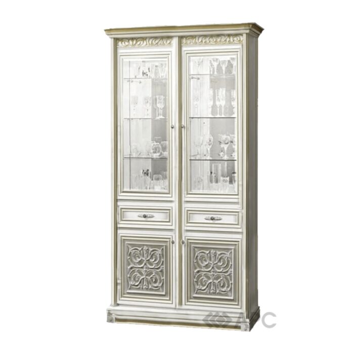 Витрина двухдверная Тоскана - это настоящее произведение искусства. Изюминкой данной модели является аккуратная и очень красивая резьба. Сочетание белого и золотого цветов сделает ежедневную домашнюю обстановку в разы праздничнее.