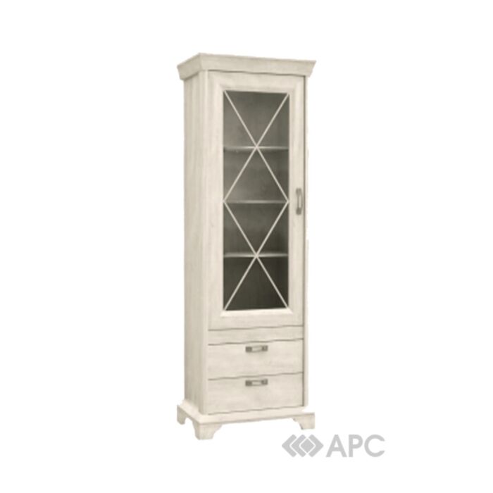 Витрина Kashmir 1D2S KSMV73 имеет смелый декоративный плинтус, массивные ножки и ручки в цвете состаренного серебра, характерного для всей коллекции. Склани участки украшают тонкие, крестообразные муллы. Мебель идеально подходит для спальни.