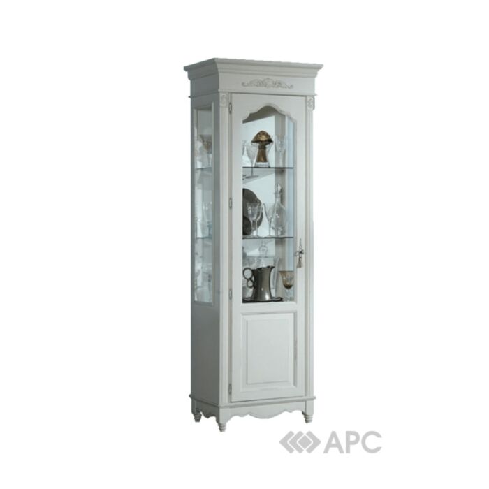 Изящный шкаф - витрина выполнен в стиле Прованс. Мебель Ривьера играет не только функциональную роль, она создает в Вашем доме уют и умиротворение французской провинции, приносит роскошь и изящество лазурного берега, знаменитой Ривьеры. Изящный, утонченный вид придают этому шкафу дверца со стеклом и стеклянные полки, декоративный карниз и резные элементы.