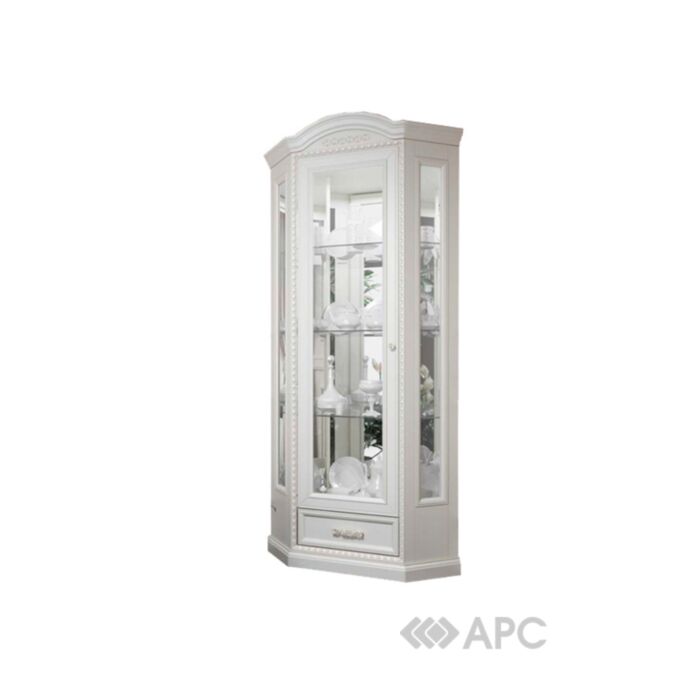 Прозрачная дверца и боковые панели, стеклянные полки придают шкафу легкость, изящность. Благодаря зеркальной задней стенке и галогенным светильникам то, что Вы поставите внутрь шкафа, будет смотреться очень эффектно.