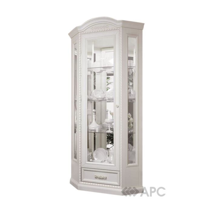 Элегантный шкаф - витрина выполнен в благородном классическом стиле. Прозрачная дверца и боковые панели, стеклянные полки придают шкафу легкость, изящность. Благодаря зеркальной задней стенке и галогенным светильникам то, что Вы поставите внутрь шкафа, будет смотреться очень эффектно.