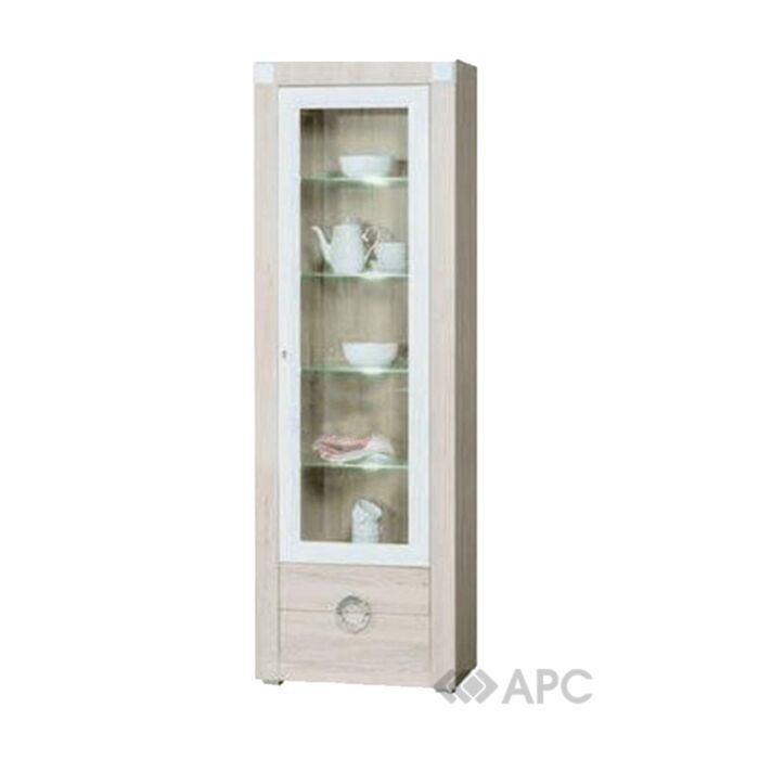 Однодверная витрина Твист оборудована двумя выдвижными ящиками и стеклянными полочками. Модель представлена в двух цветовых решениях: корпус выполнен в цвете "ясень Ниагара", а фасад - в сочетании цветов "ясень Ниагара" и "Аляска".
