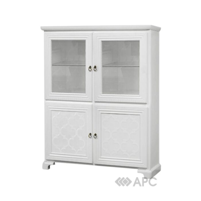 Витрина двойная Афина №3 белая гармонично сочетает элементы классического дизайна и современного стиля, поэтому подходит ценителям разных направлений в интерьере. Данная модель из коллекции имеет четыре отделения с дверцей, из которых два глухих, а два со стеклом. Фасад изделия — это патированный рамочный МДФ с лакированной филенкой с тиснением. Шкаф-витрина в гостиной идеально подходит для хранения старинной, эксклюзивной или коллекционной посуды, сувениров и книг. Такая мебель привлекает потребителей как функциональностью, так и уютным дизайном.