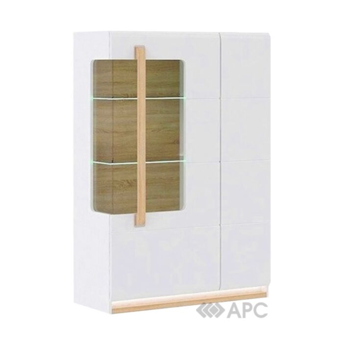 Мебель ATTENTION FORTE обращает на себя внимание стильным асимметричным дизайном и необычной подсветкой цокольных частей модулей. Корпус выполнен из ДСП в цвете «белый матовый / дуб sonoma», фасады – МДФ «белый глянцевый / дуб sonoma». Планки и ручки придают оригинальность этой коллекции. Стеклянные полки витрин оснащены подсветкой. Белоснежные глянцевые фасады разделены на сегменты и плавно скошены сверху и снизу. Мебель Аттеншн Форте позволяет создавать уникальные наборы для гостиной и столовой.