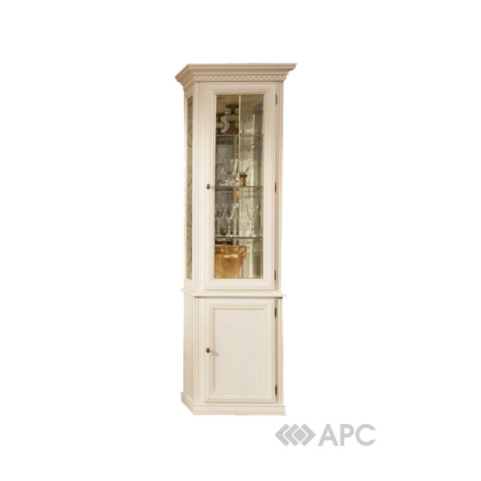 Элегантный шкаф - витрина выполнен в классическом стиле. Стеклянная дверца, боковые панели и полки придают шкафу легкость, изящность. Благодаря зеркальной задней стенке и галогенному светильнику то, что Вы поставите внутрь шкафа, будет смотреться очень эффектно.