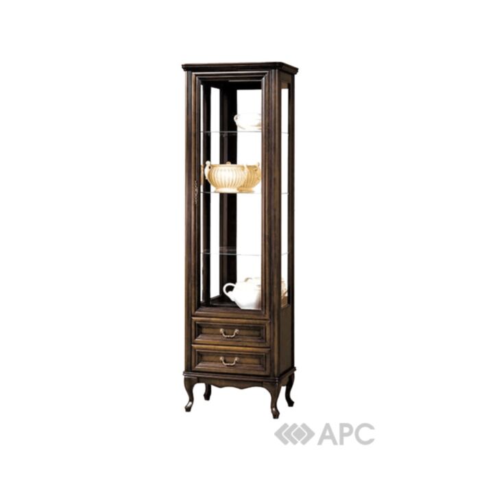 Материалы изготовления натуральные. Корпус изготавливается из МДФ, ламинированной шпоном ольхи; фасад - МДФ, ламинированная шпоном вишни; рамочный фасад - массив ольхи; ножки - массив ольхи и бука. Ручки металлические, цвет - "латунь". Витрины комплектуются прозрачным глянцевым стеклом.