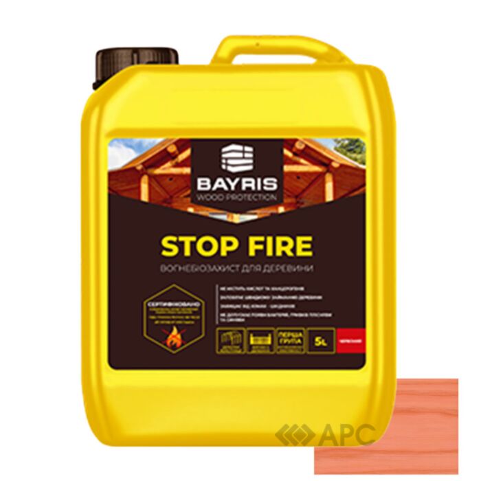 Огнебиозащита для дерева Bayris Stop Fire красная 5 л с маркировочным пигментом применяется для комплексной защиты конструкционных деревянных элементов (чердачных покрытий, каркасов, срубов, стропильных систем, несущих конструкций деревянных домов, балок и т.п.) и другой строительной древесины от огня и биологически впечатлений. Используется для всех пород древесины, не имеющих прямого контакта с водой и не подверженных атмосферным воздействиям в условиях использования. Препарат без запаха, умеренно устойчивый к вымыванию, красного оттенка. Подходит для бытового, промышленного и профессионального использования.