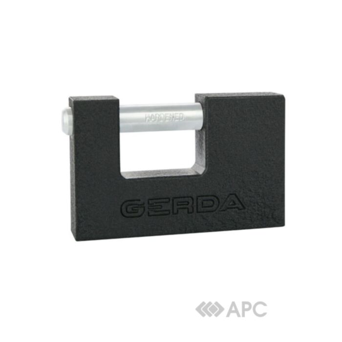 Навесной замок - Скобы и стержни стандартных навесных замков Gerda изготовлены из калённой стали. - Использование монолитного корпуса из чугуна и высокопрочных материалов для всех запирающих и крепёжных элементов значительно повышает стойкость замка, защищая его от попыток высверливания и вскрытия. - Использование чугуна позволяет применять замок во всех погодных условиях. - В комплекте к данному замку прилагается три ключа. - Материал дужки: Закаленная сталь. - Двухсторонняя блокировка дужки при запирании. - Покрытие устойчивое к корозии. - Имеется дренажное отверствие.