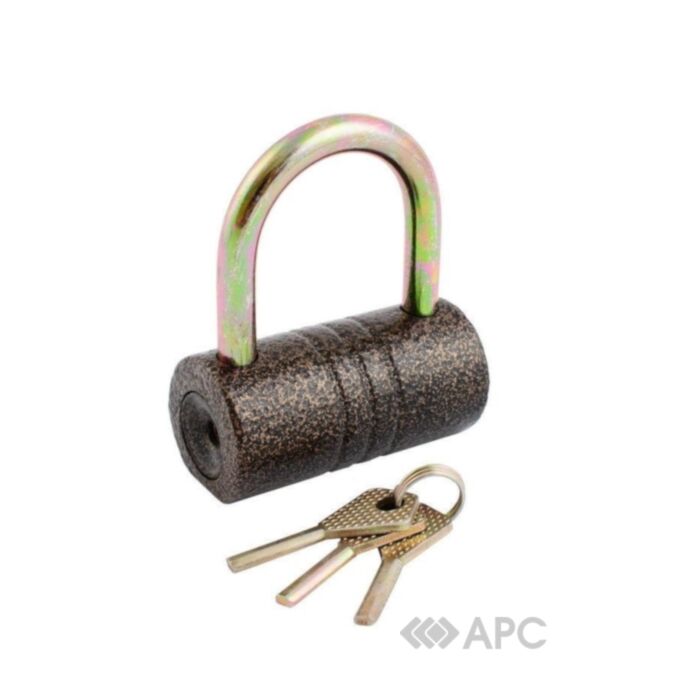 Замок изготовлен из металла и покрыт антикоррозийным покрытием, имеет литой корпус в форме цилиндра шириной 75 мм и каленую дужку. В комплекте с замком три ключа.