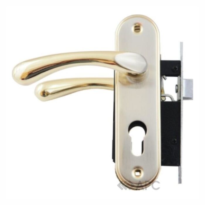 Комплект ручек для межкомнатных дверей с врезным замком под цилиндровый механизм. Комплектация: ручки на планке, корпус врезного замка, элементы крепежа. Материал: алюминий, планка - сталь, покрытие - гальваника. Межосевое расстояние 50 мм.