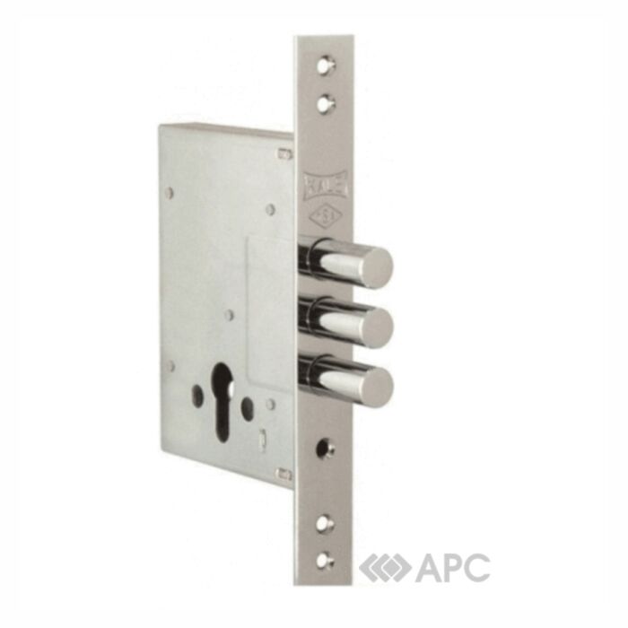Характеристики врезного замка Kale 257 - Трехригельный, запирающий, трехшаговый цилиндровый замок. Усиленная или иначе говоря "тяжелая" модель, рассчитанная на установку в массивные стальные двери. Предназначен для установки на двери толщиной до 60 мм. Планка не съемная, поэтому замок может быть установлен только как врезной. Три стальных хромированных ригеля диаметром 16 мм. Вылет ригелей 34 мм. Возможна установка как в правые,так и в левые двери. Открывание замка двухстороннее. Количество кодовых комбинаций: зависит от цилиндра Диаметр ригелей: 16 мм Выход ригелей: 34,5 мм Класс замка: 2 Механизм секретности: цилиндровый.