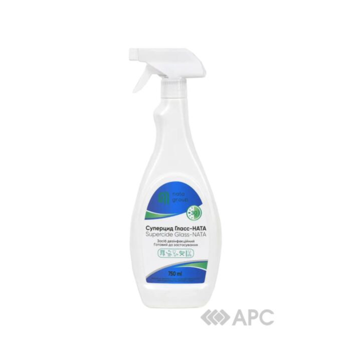 Средство дезинфекционное Гласс-НАТА Суперцид — это универсальный продукт для дезинфекции любых поверхностей, изделий медицинского значения многократного использования, а также рук. Активные свойства обладают бактерицидным, туберкулоцидным, вирулицидным и фунгицидным действием. Нежно влияет на предметы изготовленные из стекла и металла. Не оставляет следы пятен, налета. Состав продукции: пропанол-2 (изопропанол) – 60,0-65,0%; пропанол-1 – 10,0–10,5%. Флакон объемом 750 мл, имеется комфортный распылитель.