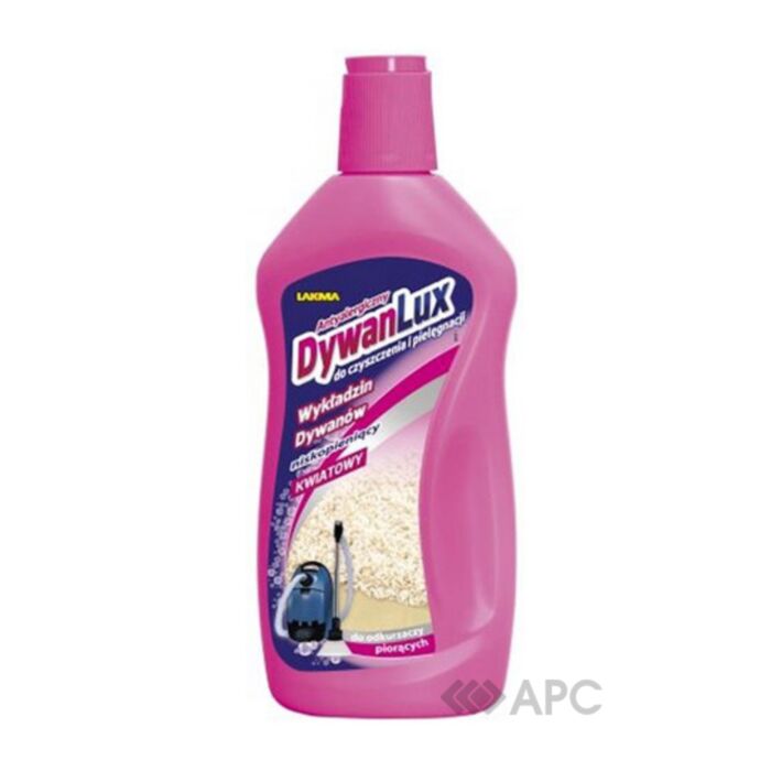 Средство по уходу за коврами DywanLux — это жидкость, которую заливают в моющие пылесосы, также ее используют для чистки ковровых покрытий, обивки автомобилей и мебели. Характеризуется глубоким воздействием на волокна, защищает их от потери цвета. Легко удаляет загрязнение любой сложности, в том числе шерсть животных, создавая таким образом антиаллергенную среду. Имеет приятный цветочный запах.