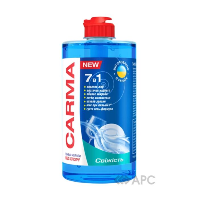 Средство для мытья посуды Carma Свежесть 500 мл – эффективно очищает загрязнение, жир, остатки пищи из столовых приборов, тарелок, чашек и других кухонных изделий. Эффективно действует как в горячей, так и в холодной воде. Присутствует легкий освежающий аромат, что делает пользование еще более приятным. Объем флакона из пуш-пул 500 мл.