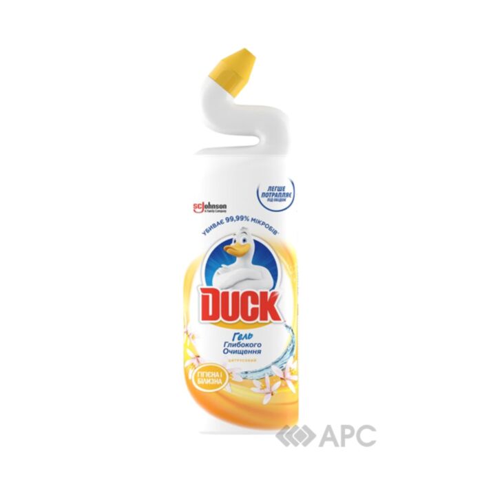 Средство для унитаза Duck 5в1 Гигиена и Белизна Цитрус — гель глубокой очистки для удаления осадка, известнякового налета, ржавчины, разного рода загрязнений. Эффективно дезинфицирует и уничтожает до 99,99% микробов, гарантируя максимальную гигиеничность поверхностей. Активные компоненты придают стенкам унитаза сияния и блеск, создают защитный слой, предотвращающий повторное образование отложений. Имеет цитрусовый аромат, устраняющий неприятный запах в туалете, поэтому вы сможете наслаждаться длительным ощущением свежести и чистоты. Продукция известной торговой марки имеет доказанную эффективность, поэтому пользуется большой популярностью среди украинских потребителей. Объем — 900 мл.