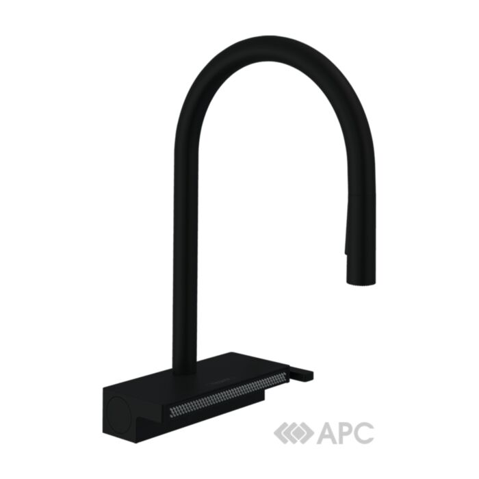 Смеситель hansgrohe MS Aquno Select M81 для кухонной мойки 73831670 черный матовый поможет реализовать самые смелые кулинарные фантазии. Изделие состоит из одно-рычажного кухонного смесителя, корпуса для шланга и многофункционального дуршлага. Воронка вытягивается на 76 см, чтобы набирать воду в разные емкости или ополаскивать раковину после мытья посуды. Под нижним душем удобно мыть руки, ополаскивать столовые приборы, ведь он не создает брызг. Смеситель Hansgrohe оснащен технологией Select – это управление устройством с помощью одной кнопки. В нижней части блока установлен рычаг для включения воды. На него удобно нажать запястьем, чтобы помыть грязные руки после обработки мяса или рыбы. Кроме того, расположена кнопка Select для переключения режимов.