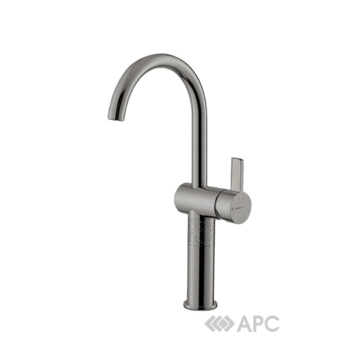 Смеситель для умывальника Newform Blink luxury 71115.58.063 PVD Gun Metal металик - это однорычажное высокое изделие с длинным изливом, спроектированное для монтажа над раковиной, без выдвижной сливной гарнитуры.