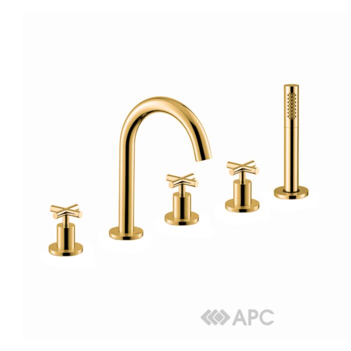 Смеситель для ванны Newform Blink 70882C.61.020 на 5 отверстий PVD Glossy gold золото - это невероятное изделие с удобным изливом, спроектированное для монтажа на борт ванны, без выдвижной сливной гарнитуры. Имеет три рычага управления и скрытую ручную душевую систему.