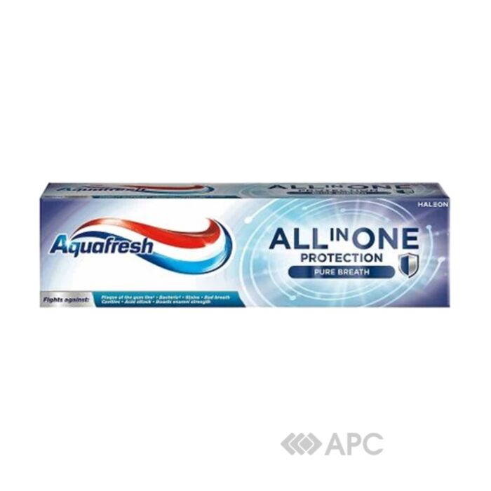 Зубная паста Aquafresh All in One Экстра свежесть 100 мл - это ежедневная защита от кариеса и комплексный уход за полостью рта. Она бережно устраняет потемнения на поверхности зубов и предотвращает образование налета, насыщает десны полезными микроэлементами. Специальная формула качественно очищает, удаляет пятна от пищи, борется с бактериями, возвращает естественную белизну эмали, укрепляет десны при условии чистки два раза в день. Содержание фтора надежно защищает зубы от сахара и кислот, вызывающих появление кариеса. Густая консистенция способствует экономному применению средства. Aquafresh All in One - это бережный уход и свежее дыхание каждый день.