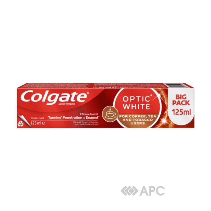 Зубная паста Colgate Optic White Чай/Кофе/Табак 125 мл — это специализированное средство, разработанное для нужд людей, которые регулярно употребляют кофе, чай или табачные изделия, вызывающие стойкие потемнения и пятна.