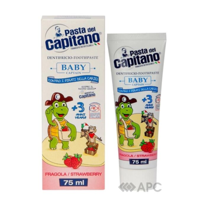 Зубная паста детская Pasta Del Capitano Baby Strawberry 3+ 75 мл с мягкой гелевой консистенцией т минимальной абразивностью, приятным клубничным вкусом, цветными микрогранулами разработана специально для детей возрастом от 3 лет. Она обеспечивает качественный уход за молочными зубчиками малышей, предотвращает накопление налета и разрушение эмали. В составе содержатся активные компоненты: фтор, кальций защищают от кариеса, бетаин и экстракт мальвы успокаивает десна, а молекулы цинка гарантируют антибактериальный эффект. Это оптимальный выбор заботливых родителей, ведь в средстве отсутствует лаурилсульфат натрия, триклозан, парабены, консерванты.