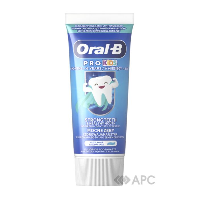 Зубная паста Oral-B Pro Kids Нежный Вкус 50 мл предназначена для бережного ухода за полостью рта малышей. Специальная формула качественно очищает, удаляет пятна от пищи, возвращает естественную белизну детских зубов, укрепляет десны. Благодаря добавлению фтора, паста защищает зубы от сахара и кислот, вызывающих появление кариеса. Пасту рекомендуется применять вместе с детской зубной щеткой Oral-B, чтобы сформировать приятные ритуалы и закрепить полезную привычку у детей. Имеет приятный мятный вкус, надолго оставляет ощущение свежести во рту. Густая консистенция способствует экономному применению средства. Oral-B- это комплексный уход за полостью рта детей в период до 6 лет.