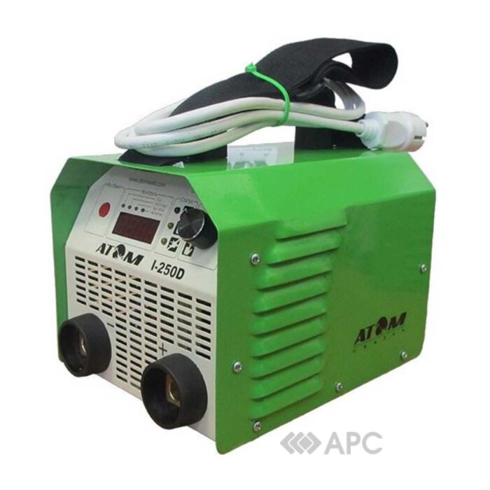 Атом-I-250D — сварочный аппарат повышенной мощности. Станет отличным вариантом для большинства пользователей. Возможно подключение к бытовой сети 220 В. Отличается высокой степенью безопасности. Рабочий ток регулируется в пределах 10-250 А. Дополнительные функции: «горячий старт», форсаж дуги. Диаметры электродов: 1,6-5 мм. Максимальная мощность составляет 8 кВт. Напряжение холостого хода: 55 В. Рабочий цикл: 100% при 190 А, 60% при 240 А. Также присутствуют: цифровой дисплей для контроля работы, выбор режимир работы. Класс защиты корпуса: IP21. Вес инвертора составляет 6,6 кг.