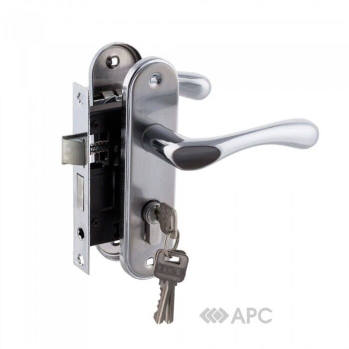 Комплект ручок для міжкімнатних дверей з врізним замком під циліндровий механізм Комплектація: ручки на планці, корпус врізного замка, елементи кріплення Матеріал: алюміній, планка-сталь, покриття-гальваніка