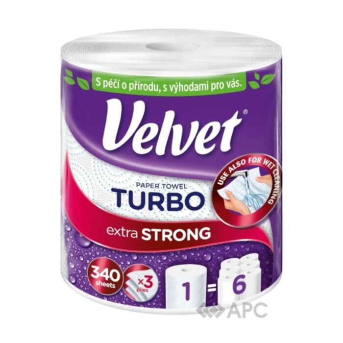 Рушники паперові Velvet Turbo — це універсальна паперова продукція, яка призначена для побутового використання. Характеризується великою вологопоглинальною здатністю та підвищеною щільністю, оскільки виготовлений зі 100% целюлози, яка вважається екологічно чистою сировиною. Двошарового типу, з присутнім тисненням, що додатково скріплює листи між собою. Перфорація, відмінно розділяє листи між собою, робить користування ще зручнішим та економнішим. Рулон налічує 340 аркушів. Український виробник випускає продукцію з економічно-вигідною ціною.