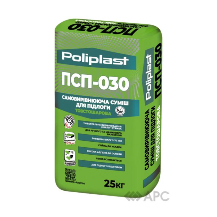 Самовирівнююча суміш для підлоги Поліпласт ПСП-030 - це суміш цементу, гіпсу з мінеральними наповнювачами та полімерними модифікаторами. Вона застосовується для фінішного товстошарового вирівнювання і для підготовки горизонтальних стійких основ під укладання фінішних покриттів для підлоги (плитки, паркету, ламінату, лінолеуму і ковроліну).