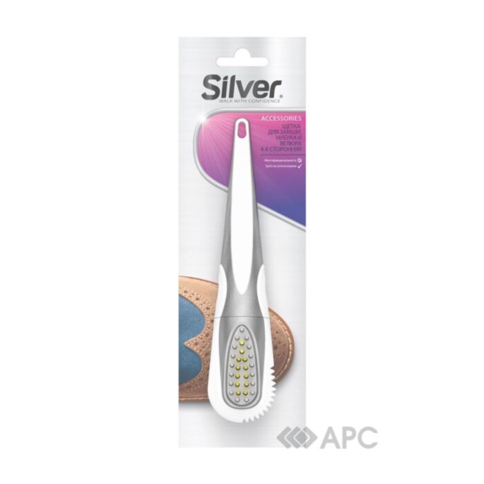 Щітка для нубуку та замші Silver — це продукція турецького виробника, що допомагає легко доглядати за виробами із примхливих матеріалів. Оснащена чотиристоронніми робочими поверхнями, кожна з яких відповідає за свій процес. М'яка гумова бічна частина допомагає приховати тріщини й плями, забезпечує ефективне видалення бруду із бічних швів. Тверда гумова сторона відновлює зовнішній вигляд. Жорсткий ворс у поєднанні з латунною щетиною очищають засохлі, а також липкі забруднення.