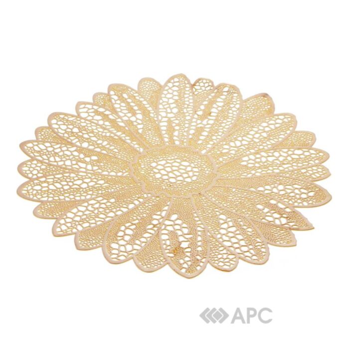 Серветка сервірувальна Bona Di Ажурна квітка золото 444-110 38 см є не тільки красивим аксесуаром, який здатний зробити повсякденний стіл святковим, але також і практичним виробом, що захистить поверхню столу, якщо ви ставите на нього гаряче. На таку сервірувальну серветку можна поставити вазу з квітами або фруктовницю. Дуже практичний аксесуар, якщо доводиться близько розміщувати столові комплекти для великої компанії. Чи не буде питань "чия це вилка", якщо вона знаходиться на зручному контрастному килимку.