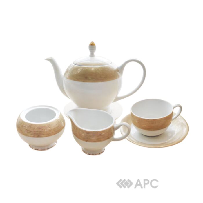 Сервіз чайний Porcelana Bogucice Gold Ring 12 персон — відмінний варіант для людей, які цінують в посуді довговічність, актуальність дизайну і фасону, які протягом багатьох років не виходять з моди. Такий набір буде красивим та практичним доповненням великого масштабного чаювання на велику кількість людей. До кладу його матеріалу входять кращі сорти глини, характеристики яких поліпшуються завдяки додаванню добавок та правильній технології виробництва. У комплектацію товару входять чашки з блюдцями, десертні тарілки, цукорниця, молочник та чайник з кришкою. Кожен елемент має приємний білий колір з широким золотим обідком по краях.