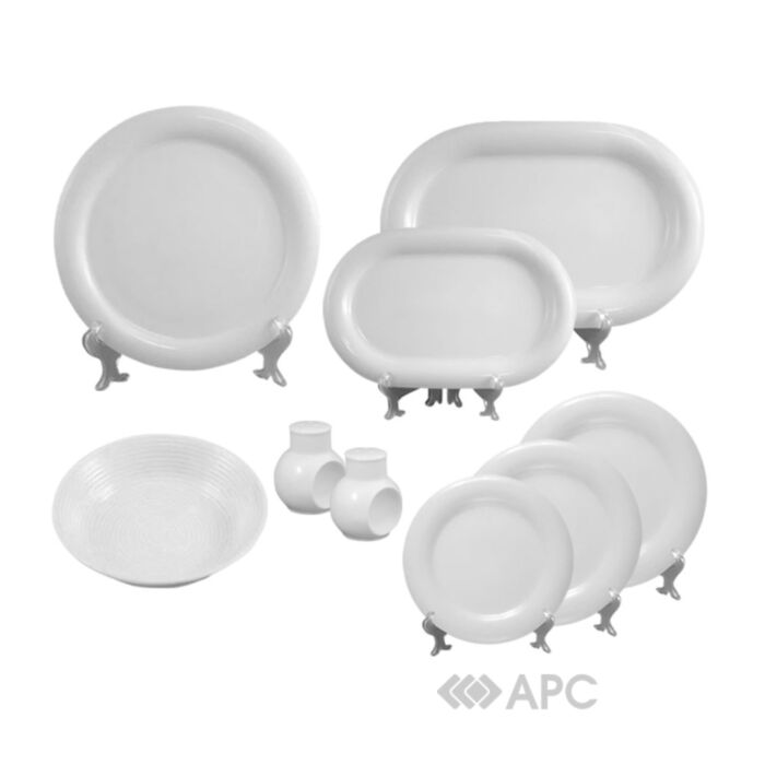Сервіз столовий Thun Catrin 2500000/12 персон чеського виробництва виготовляється з якісної порцеляни. Він легко стане прикрасою кухні або красиво сервірованого столу завдяки вишуканому дизайну, плавним лініям та приємному білому кольору. Набір розрахований на 12 персон та складається з 46 предметів: 3 видів тарілок по 12 штук, 1 овальної тарілки більшою та 1 меншої, 4 салатників, 2 великих круглих тарілок і ємностей на сіль та перець.