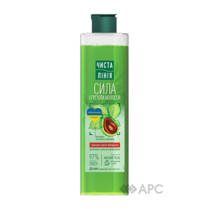 Шампунь Чиста Лінія Сила і густота з екстрактом кінського каштана 390 мл – це надійний засіб очищення та посилення росту волосся. Містить у складі 80% рослинних компонентів, що насичують пасма корисними речовинами та покращують їх зовнішній вигляд. Натуральний екстракт кінського каштана активізує волосяні фолікули, стимулюючи ріст. Вітаміни й мінерали живлять і відновлюють волосину зсередини. Відвар трав (деревій, кропива, хміль, звіробій, ромашка) живить волосяні фолікули, покращує ріст та має інтенсивну бактерицидну дію. Засіб м’яко усуває забруднення, залишки косметичних засобів, себум та бактерії. Чиста Лінія – це щоденний догляд для краси та здоров’я вашого волосся.
