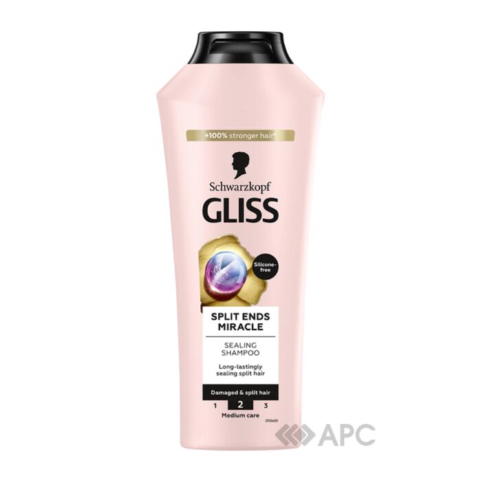 Шампунь Gliss Kur Split Ends Miracle - розроблений для догляду за пошкодженим волоссям та посіченими кінчиками. Він поєднує в собі Комплекс Іонів і Олію Виноградних Кісточок, що ефективно відновлюють пасма та зменшують ламкість. Засіб діє як фіксатор, сприяючи довготривалому склеюванню посічених кінчиків і зменшуючи їх кількість до трьох разів.