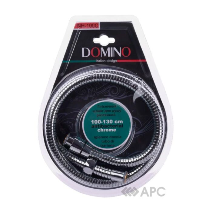 Шланг для душу DOMINO NH-100C 100 - 130 см хром з гайками стандартного розміру, що є елементом для душової системи забезпечить приплив води до лійки. Довговічний виріб, дуже простий в обслуговуванні, не вимагає спеціального складного догляду, при цьому приємно виглядає і справно функціонує. Ефективне вирішення завдань, пов'язаних водозабезпеченням, яке дозволить прийняти душ в будь-який зручний для вас момент. Крім шлангів в нашому інтернет-магазині в наявності змішувачі, лійки, вентилі та інші комплектуючі, які можуть стати в нагоді в ванній кімнаті та на кухні.