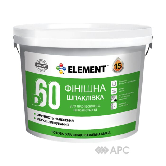 Шпаклівка фінішна Element D60 акрилова 27 кг — це готова до застосування пастоподібна фінішна шпаклівка, яка ідеально підходить для вирівнювання та ремонту дефектів на різних типах поверхонь. Її еластична тиксотропна консистенція забезпечує зручність у роботі, а також дозволяє досягти високої якості обробки. Має молочно-білий відтінок, який не жовтіє з часом, і легко наноситься на поверхню. Вона добре шліфується, а також має мінімальний розкид шліфувального пилу, що робить її зручною в процесі обробки. Element D60 сумісна з усіма видами фарб і декоративних матеріалів, що дозволяє використовувати її в різноманітних оздоблювальних роботах.
