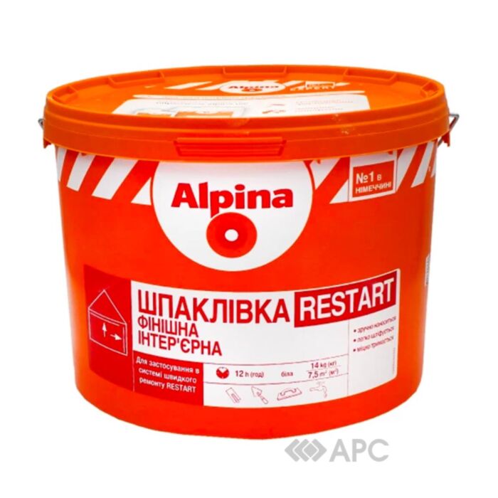 Шпаклівка фінішна інтер'єрна Alpina — це біла суміш, що наноситься для остаточного вирівнювання, перед завершальним оздобленням стін або для ремонту раніше оштукатурених поверхонь. Виготовлена для виконання швидкого ремонту RESTART, адже легко наноситься та швидко сохне до 24 год, на акриловій основі. Має високий ступінь білизни, екологічний склад, без шкідливих домішок, зручно шліфується у сухому стані. Характеризується стійкістю до вологи та паропроникністю, застосовується при температурі +5°…+35°C. Вага продукції 14 кг, витрати 150 мл/м².