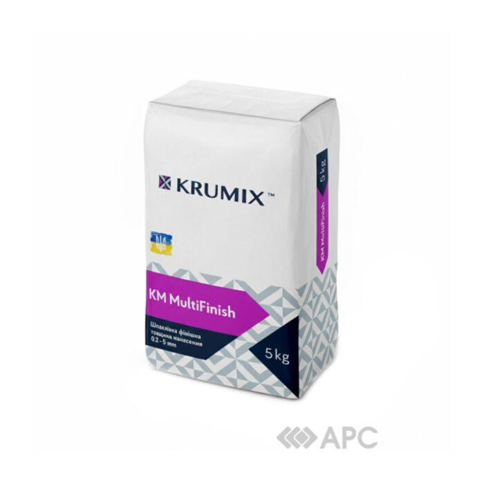 Шпаклівка фінішна Krumix КМ MultiFinish М – це багатофункціональна суха шпаклювальна суміш на основі натурального в’яжучого гіпсу, модифікована мінеральними та спеціальними добавками, що забезпечують високу адгезію, водоутримуючу здатність і оптимальний час роботи; міцна, армована мікроволокнами. Суміш є універсальною та призначена для ручного шпаклювання всередині приміщень. Властивості: Товщина шару шпаклівки мінімальна товщина: 0,2 мм, максимальна товщина: до 5 мм; Кількість води (водопотреба) 10-12 л води на 25 кг сухої суміші; Час використання готової розчинової суміші 60 хвилин; Міцність на розтяг при вигині у віці 7 діб не менше 2,0 МПа; Міцність на стиск у віці 7 діб не менше 4,0 МПа; Міцність зчеплення з основою не менше 0,4 МПа; Паропроникність 0,089 мг/м год Па; Усадка не більше ніж 0,5 мм/м; Тріщиностійкість відсутність тріщин на шарі товщиною 5 мм.