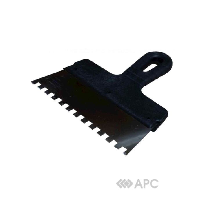 Шпатель для плитки із розміром зуба 8х8 використовується для видалення надлишків плиткового клею. На першому етапі для нанесення будівельної суміші використовується прямий шпатель, надлишки ж розчину знімаються гребінкою. Клей, який залишається на поверхні, можна рівномірно розподілити при укладанні плитки і притисканні. Таким чином забезпечується висока якість результату, швидкість роботи, на видавлювання лишнього розчину не йде багато сил, а надлишків практично не буде, оскільки клей буде заповнювати створений зубчастим шпателем прогалини. Підвищується і міцність з'єднання між плиткою та поверхнею, адже надлишок клею може його погіршити. Для більш зручної роботи в каталозі нашого інтернет-магазину Ви також можете знайти прямокутну кельму-гладилку, дві сторони якої мають зуби, а дві інші є прямими. Це виключає постійну зміну прямого та зубчастого шпателя для нанесення та зняття розчину.