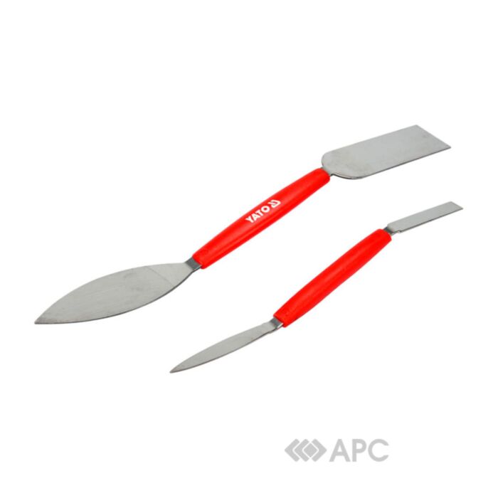 Шпателі штукатурні Yato YT-52780 двосторонні 2 шт. призначені для точних ліпних і художніх робіт. Розміри: 8 x 192 мм і 26 x 254 мм. Робоча частина шліфування: 1,45–0,6 мм. Леза виготовлені з нержавіючої сталі, ручка — пластикова.