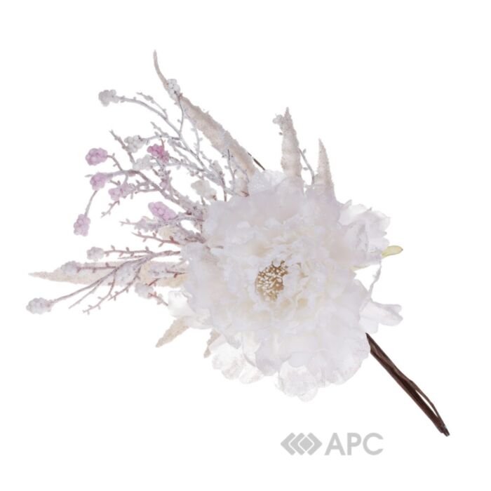 Квітка піона доповнена характерним зимовим декором, що робить її ідеальною для використання у різдвяних букетах, вінках чи інших композиціях. Основою для створення пелюсток та листя є тканина, що забезпечує реалістичний зовнішній вигляд та текстуру. Стебло та внутрішня конструкція містять дріт, що дозволяє легко гнути та фіксувати елемент у потрібному положенні.