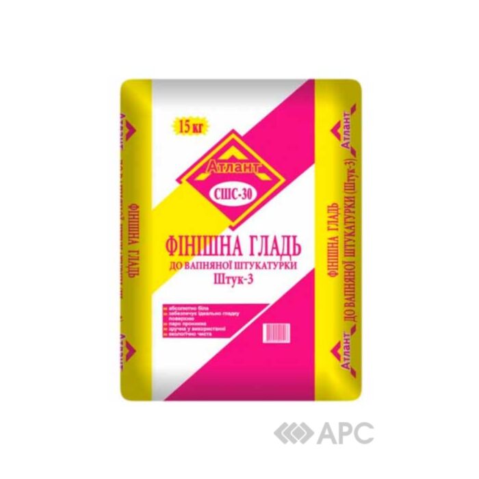 Штукатурка фінішна Атлант СШС-30 Штук-3 вапняна 15 кг це високоякісна, екологічно чиста суха суміш для виконання штукатурних робіт з товщиною шару до 12 мм на основі вапна з інертним наповнювачами та модифікаторами. Технічні характеристики: витрати для приготування розчину 0,6 - 0,65 л/кг; час використання 6-8 годин; витрати при товщині кулі 1 мм 0,8-1,2 кг/м2; товщина штукатурки 3-12 мм. Купити штукатурку фінішну Атлант СШС-30 Штук-3 вапняна 15 кг можна в інтернет магазині АРС. У нас завжди актуальна і доступна ціна. Доставка здійснюється по Україні - Київ, Харків, Львів та ін.