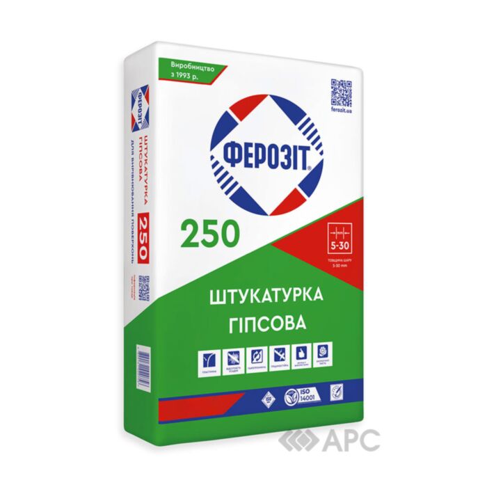 ФЕРОЗІТ 250 — суха суміш на основі гіпсу з наповнювачами та полімерними модифікаторами для вирівнювання поверхонь з цегли, бетону, пінобетону, старої штукатурки всередині приміщень. Суміш зберігати в сухих приміщеннях в непошкодженій упаковці. Не допускати контакту мішків з вологими стінами чи підлогою. Термін зберігання — 12 місяців від дати виготовлення. Технічні характеристики: Витрати — 12 кг на 1 м2 при товщині шару 10 мм; Витрати води для приготування розчину — 0,35-0,40 л/кг; Товщина шару — до 15 мм; Час придатності розчину — 1,5 год; Температура виконання — від +5°С до +30°С; Міцність зчеплення з основою (адгезія) — > 0,5 МПа. Купити штукатурку стартову Ферозiт 250 гіпсову 40 кг можна в інтернет магазині АРС. У нас завжди актуальна і доступна ціна. Доставка здійснюється по Україні - Київ, Харків, Львів та ін.